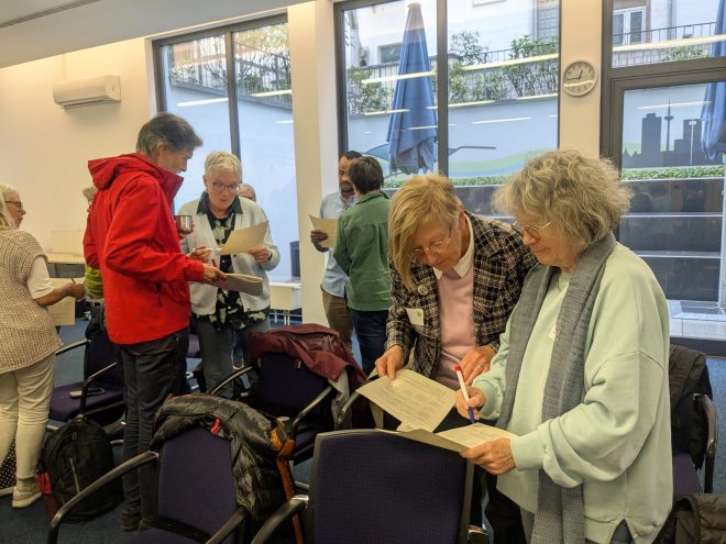Nach der Wiederauszeichnungsfeier im Römer ging der 24. September nahtlos in den nächsten Höhepunkt über: Das Vernetzungstreffen unserer Fairen Metropolregion FrankfurtRheinMain. Im Regionalverband FrankfurtRheinMain kamen rund 40 Personen zusammen, um neue Kontakte zu knüpfen, Ideen zu spinnen, und in Workshops Fachwissen und Praxistipps austauschen zu können.